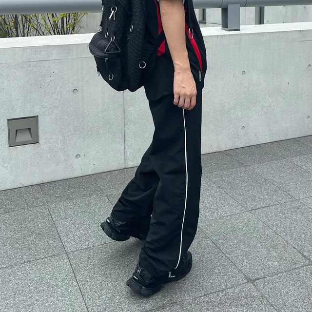 シンプルなラインディテールのナイロンパンツ ピンラインでユニークかつミニマルな演出 ウエストバンディングと、裾のストリングスナップで様々な身長の方に対応します ユニセックスで着用できます color black size (cm) FREE: 総丈 107 / ウエスト ~37 / 股上 27 / 裾 24 ※サイズは、測定方法に応じて1〜3cmの誤差が 生じる場合があります。 model size : FREE (men 176cm) ※通常1〜5営業日での発送となります。 ご理解よろしくお願いします。 ※決算後のキャンセルは出来兼ねます。