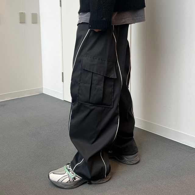 パイピングラインがポイントのカーゴパンツ ウエストバンディング 裾スナップ付き ユニセックスで着用可能 color black size (cm) FREE: 総丈 106 / ウエスト 34~ / 股上 37 / 裾 27 ※サイズは、測定方法に応じて1〜3cmの誤差が 生じる場合があります。 model size : FREE (men 176cm) ※通常1〜5営業日での発送となります。 ご理解のほどよろしくお願いいたします。 ※決算後のキャンセルは出来兼ねます。