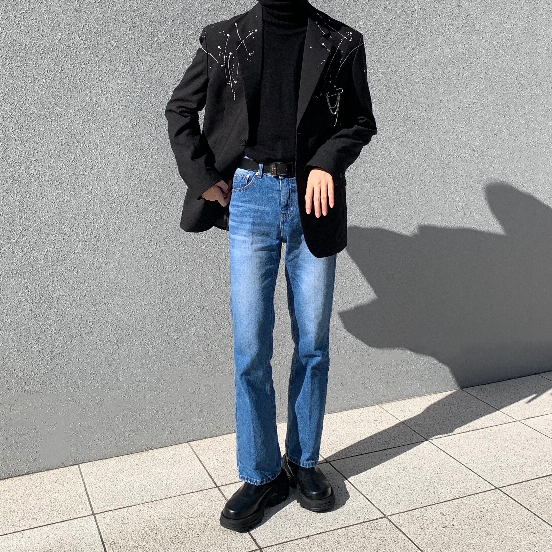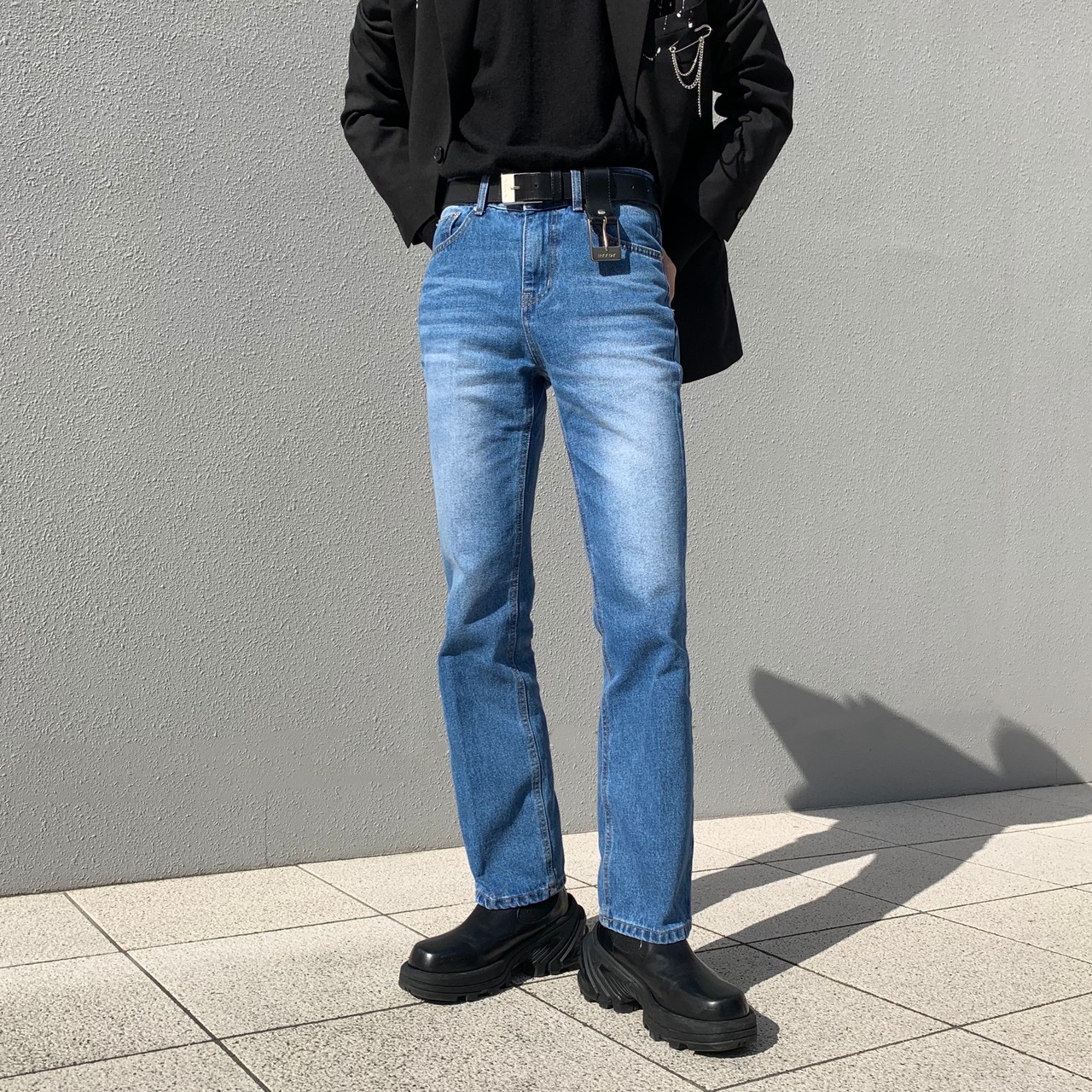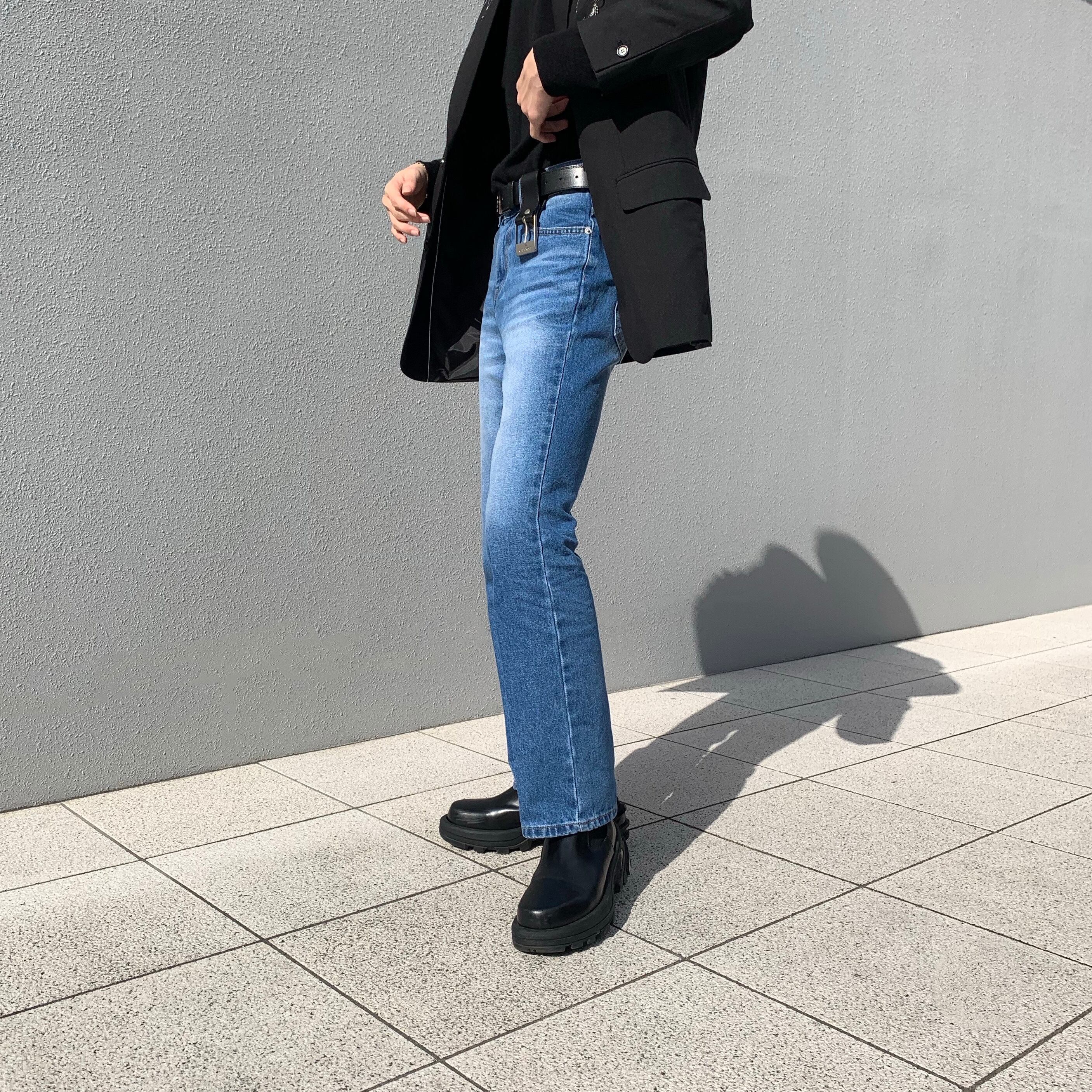 ブーツやハイカットスニーカーに合わせやすい丈感のフレアデニムです。