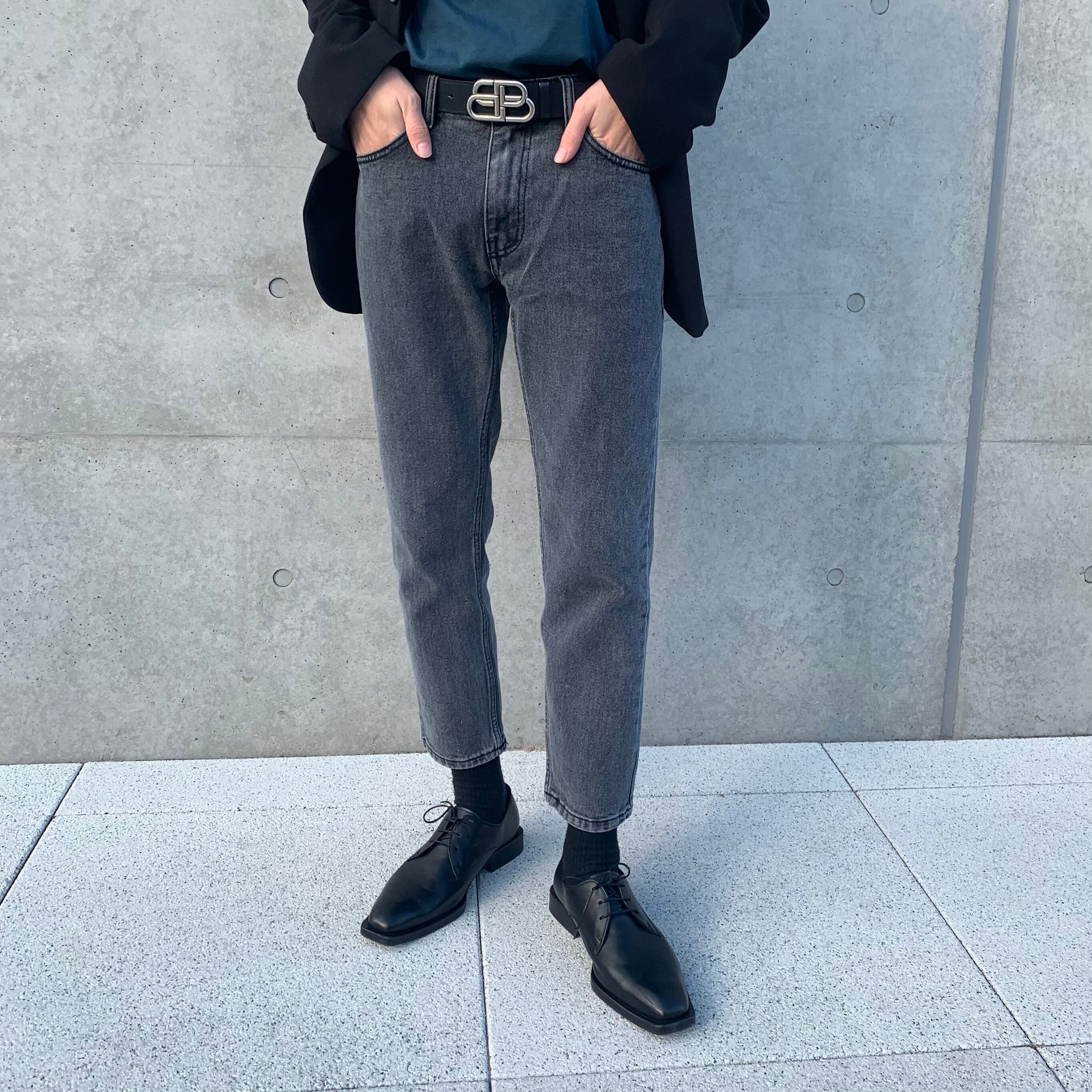スリムフィットのストレートフィット。 クロップド丈のすきっりしたシルエットでウォッシュ加工されたようなグレーカラーデニムです。