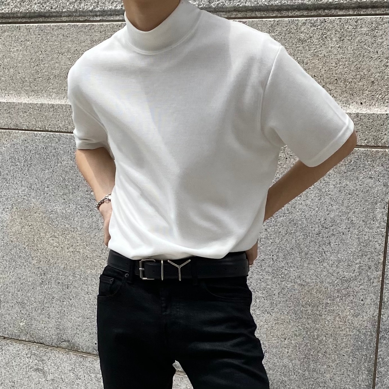 オーバーフィットシルエットのモックネックTシャツです。