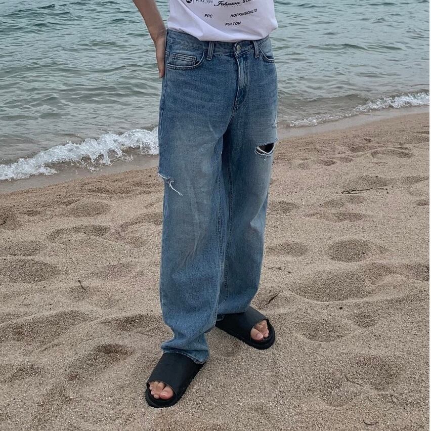 左右でデザインの違うダメージディテールのワイドフィットデニムです。